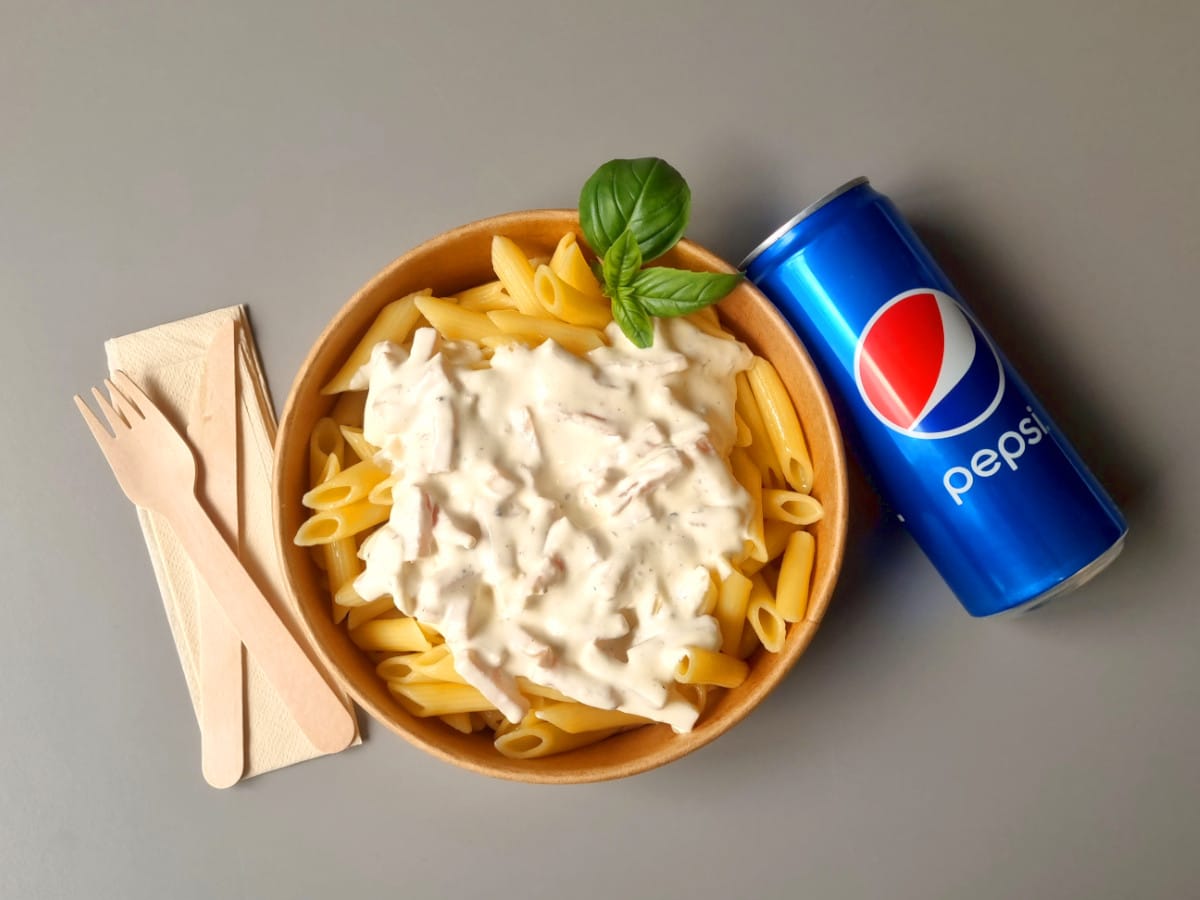 Salade, burrata, lardinettes de volailles, pâtes au basilic, tomate, sauce balsamique