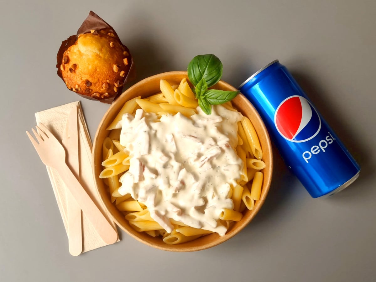 Salade, burrata, lardinettes de volailles, pâtes au basilic, tomate, sauce balsamique