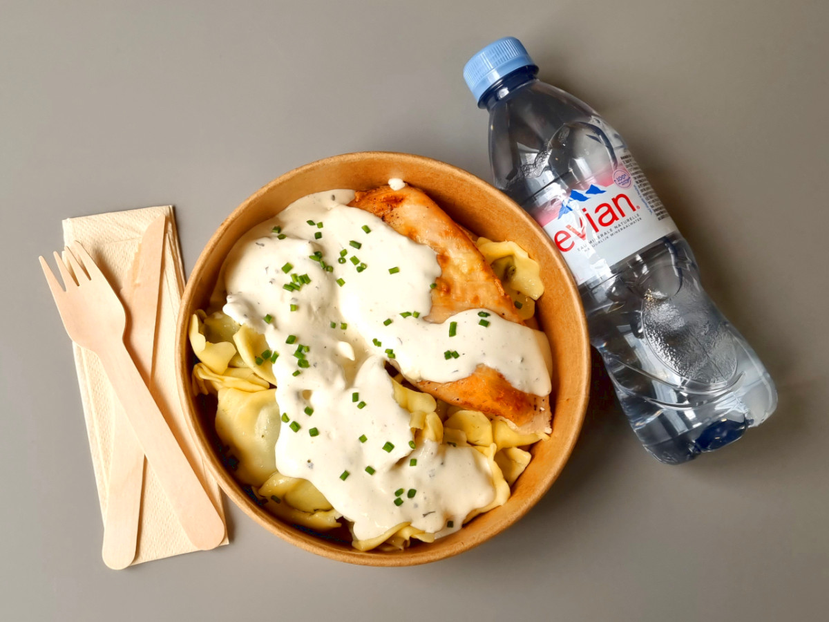 Filet de poulet sauce forestière, gratin de pomme de terre et haricots verts